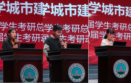 两位考研先进学生代表依次上台发言:考取华中科技大学的王紫薇同学讲到,选择学校时切忌盲目跟风,同时,静下心来坚持是每个考研人所必备的品质。申请到悉尼大学等多所澳大利亚知名大学研究生“offer”的周甄能同学讲到,在国内考研压力日趋增大的背景下,申请海外留学是不错的选择。他从“注重平时成绩”和“提前学好外语”两方面做了经验分享。